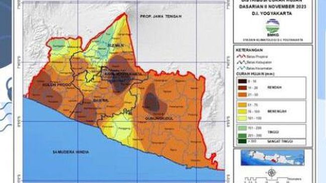 "Sebaran curah hujan selama periode dasarian II November 2023 (tanggal 11 s/d 20) wilayah DI Yogyakarta dalam kategori rendah-tinggi dengan curah hujan berkisar 0-200 mm," seperti dikutip dari media sosial resmi Staklim BMKG DIY, Senin (20/11/2023).