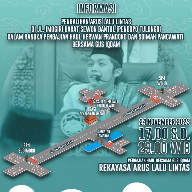 Kasi Humas Polres Bantul Iptu I Nengah Jeffry menjelaskan rekayasa lalin bakal berlangsung mulai pukul 17.00 WIB hingga pukul 23.00 WIB. Pasalnya di Pendopo Tulungo berlangsung pengajian Haul Leluhur Herwan Prandoko dan Soimah Pancawati bersama Gus Iqdam.