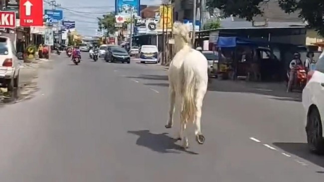 Heboh di media sosial (medsos) video kuda berwarna putih lepas di Jalan Godean KM.5 Kalurahan Nogotirto, Gamping, Sleman. Video ini diunggah oleh akun Instagram @Instagram milik @merapi_uncover.