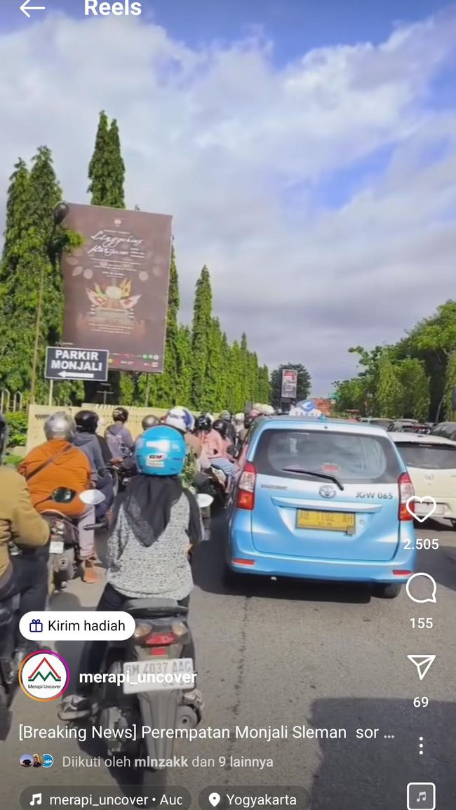 "Perempatan Monjali Sleman sore ini macet," dikutip dari akun Instagram @merapi_uncover, Sabtu (2/12/2023).