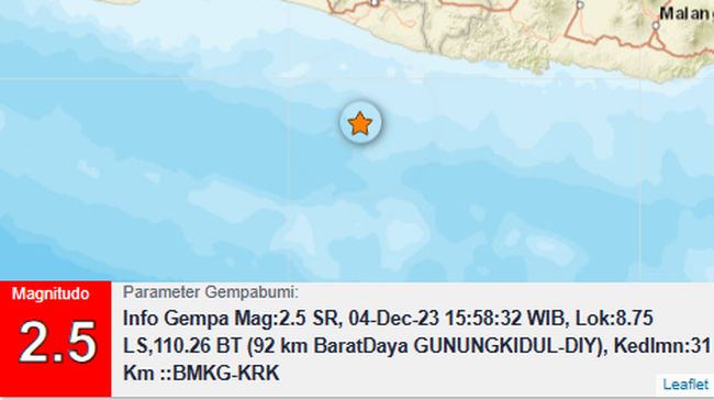 "Info Gempa Mag:2.5, 04-Dec-23," demikian dikutip dari akun resmi X BMKG DIY @bmkgjogja, Senin (4/12/2023).