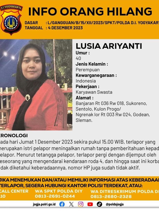 Nugroho bilang dalam laporan polisi, Lusia berdomisili di Sukoreno, Sentolo, Kulon Progo dan Ngrenak Lor, Godean, Sleman. Lusia dilaporkan telah pergi dari rumah sejak Jumat (1/12) lalu.