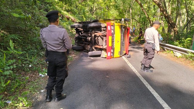 "Saat naik tanjakan Kaliurang truk tidak kuat dan mundur, lalu terperosok tebing jalan hingga terguling," kata Jeffry kepada wartawan, Jumat (8/12/2023).