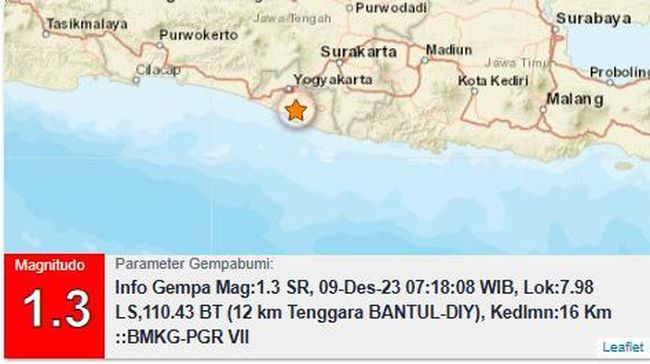 - Info Gempa Mag:1.3, 09-Des-23 07:18:08 WIB, Lok:7.98 LS,110.43 BT (12 km Tenggara BANTUL-DIY), Kedlmn:16 Km ::BMKG-PGR VII