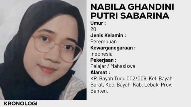 Dalam Instagram Polda DIY @poldajogja, Selasa (12/12), disebutkan bahwa Nabila merupakan mahasiswi yang berdomisili di Kampung Bayah Tugu 002/009, Kelurahan Bayah Barat, Kecamatan Bayah, Kabupaten Lebak, Banten.