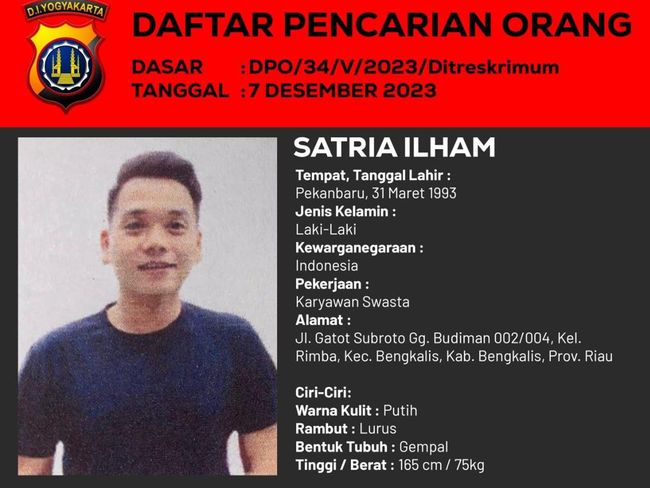 Dikutip dari akun X Polda DIY @poldajogja, Satria Ilham yang berusia 30 tahun itu ditetapkan sebagai DPO dengan dasar DPO/34/V/2023/Ditreskrimum yang dirilis pada 7 Desember 2023.