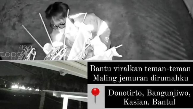 Beredar video bernarasi seorang pria mencuri jemuran celana dalam di salah satu rumah warga di Bangunjiwo, Kapanewon Kasihan, Bantul. Video yang beredar di media sosial itu adalah rekaman kamera CCTV di lokasi kejadian.