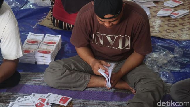 Pantauan detikJogja, tampak puluhan orang duduk dan sibuk melipat surat suara. Tampak pula beberapa orang melipat suara dengan botol kaca agar lipatannya presisi.