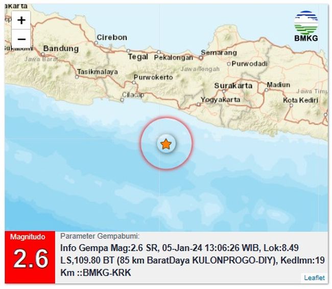 "Info Gempa Mag:2,6, 05-Jan-24," kata Badan Meteorologi, Klimatologi, dan Geofisika (BMKG) DIY dalam keterangan tertulisnya, Jumat (5/1/2024).