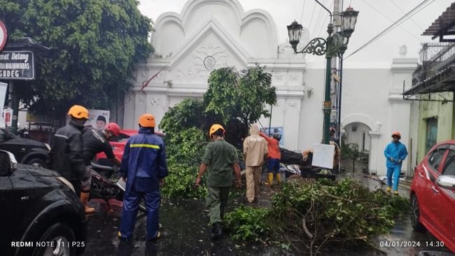 Sebelumnya, hujan lebat disertai angin kencang melanda Kota Jogja, Kamis (4/1) siang. Satu pohon tumbang menimpa satu andong di Jalan Ibu Ruswo, Gondomanan, Kota Jogja, tepatnya di kawasan Plengkung Wijilan.