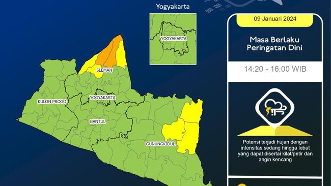 "Peringatan dini cuaca DI Yogyakarta tanggal 9 Januari 2024 pukul 14.06 WIB berpotensi terjadi hujan sedang-lebat yang dapat disertai kilat/petir dan angin kencang pada pukul 14.20 WIB," tulis Prakirawan BMKG DI Yogyakarta dalam keterangannya, Selasa (9/1/2024).