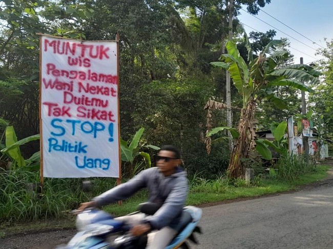 Ada spanduk tak biasa tentang politik uang di dekat Kantor Kalurahan Muntuk, Kapanewon Dlingo, Kabupaten Bantul. Tulisannya, 'Muntuk Wis Pengalaman, Wani Nekat Duitmu Tak Sikat, Stop Politik Uang!'. Spanduk anonim dari cat semprot ini pun menuai apresiasi Bawaslu.