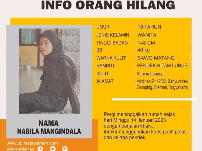 Kabar hilangnya Nabila dirilis oleh Polresta Sleman di akun resmi Instagram @polrestasleman. Disebutkan, Nabila sudah pergi dari rumah sejak Minggu (14/1/2024).