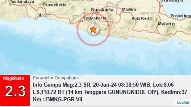 "Info Gempa Mag:2,3, 20-Jan-24," kata Badan Meteorologi, Klimatologi, dan Geofisika (BMKG) DIY dalam keterangan tertulisnya, Sabtu (20/1/2024).