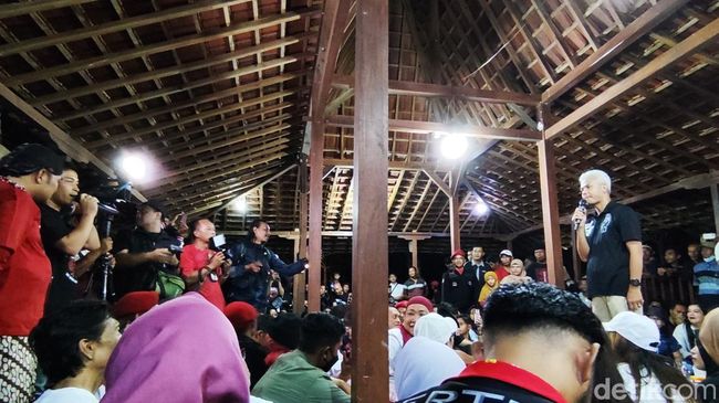 Pantauan detikJogja di lokasi, Ganjar dan rombongan tiba pukul 19.05 WIB. Ganjar tampak mengenakan kaus hitam bertulis Sat Set di punggung dan bergambar jari tiga.