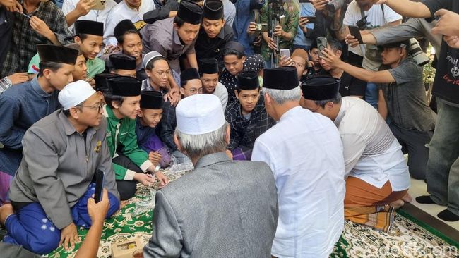 Pantauan detikJogja, Kamis (25/1/2024), Ganjar datang mengenakan baju koko warna putih, celana warna krem dan peci warna hitam. Selanjutnya Ganjar mendatangi para santri dan dhahar kembul dengan menu jenang merah putih.