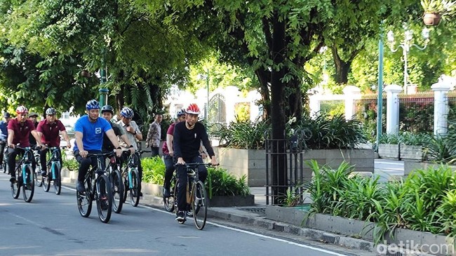 Jokowi tampak mengenakan kaus hitam lengan panjang dengan helm merah bercorak putih. Ia menggunakan sepeda hitam.