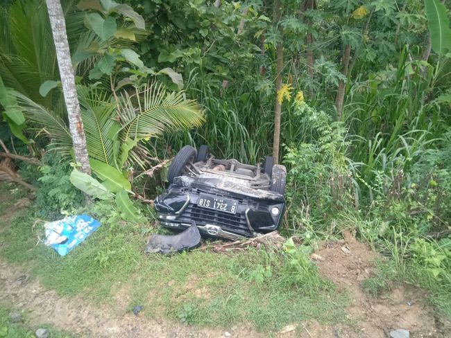 Di lokasi kejadian, mobil itu tiba-tiba oleng gegara supirnya mengantuk. Akibatnya, mobil itu terperosok ke jurang di tepi jalan dalam kondisi terbalik.