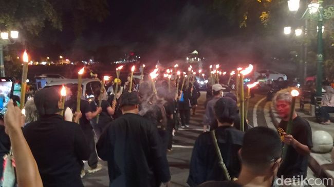 Puluhan eks aktivis 98 di Jogja menggelar aksi jalan mundur. Berawal dari depan Alun-Alun Utara hingga Malioboro, tepatnya Gedung Agung Istana Presiden, Kamis malam (8/2/2024). Sambil berjalan mundur, para peserta aksi membawa obor api yang terbuang dari batang bambu.