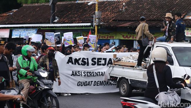 Pantauan detikJogja, Senin (12/2/2024), pukul 15.48 WIB, massa aksi tiba di simpang tiga. Mereka membawa sejumlah poster tuntutan berisi kritikan ke pemerintah.