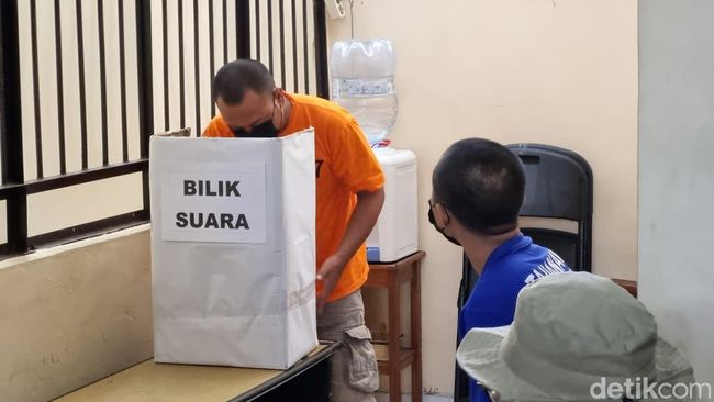 Pantauan detikJogja, Rabu (14/2/2024), tampak para tahanan mengantre di dekat bilik suara Rutan Polres Bantul. Selanjutnya, secara silih berganti mereka masuk ke dalam bilik suara untuk mencoblos.
