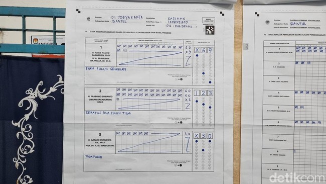 "Selanjutnya untuk pasangan nomor urut 02 Prabowo-Gibran meraup 123 suara. Sedangkan pasangan nomor 03, Ganjar Pranowo-Mahfud Md mendulang 30 suara," katanya kepada wartawan di Rukeman, Tamantirto, Kasihan, Bantul, Rabu (14/2/2024) petang.