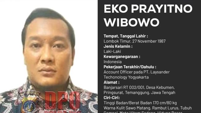 Eko Prayitno Wibowo (36) warga Banjarsari, Desa Kebumen, Pringsurat, Temanggung, Jawa Tengah, menjadi buron Polda DIY. Eko diduga terlibat kasus penggelapan di kantornya. Seperti apa ciri-cirinya?
