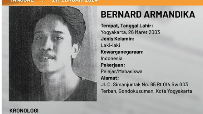 Seorang pemuda bernama Bernard Armandika (20) dilaporkan hilang. Pemuda yang beralamat di Jalan C Simanjuntak, Terban, Gondokusuman, Kota Jogja, itu sudah tak bisa dihubungi sejak akhir Januari 2024.