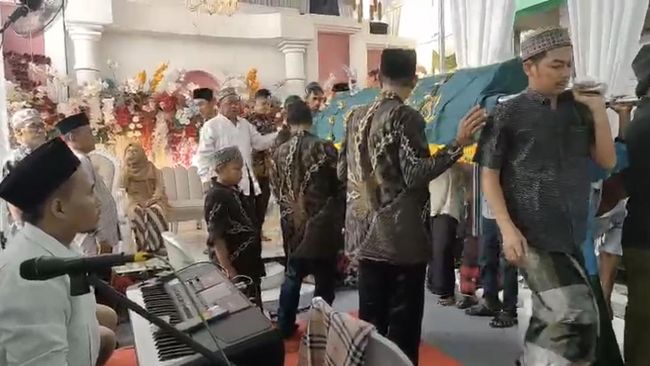 Dalam video berdurasi 24 detik itu, tampak keranda jenazah bersama iring-iringan masuk melewati tenda resepsi perkawinan. Sontak, para tamu yang hadir langsung memberikan jalan supaya pembawa keranda dan pelayat yang ikut bisa lewat.