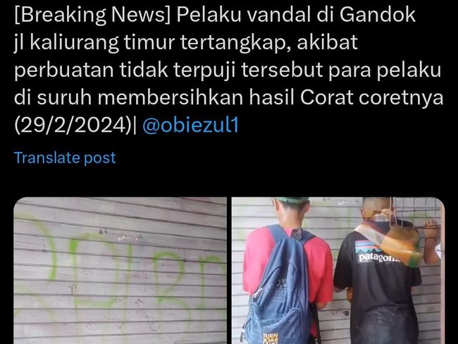 "[Breaking News] Pelaku vandal di Gandok jl kaliurang timur tertangkap, akibat perbuatan tidak terpuji tersebut para pelaku di suruh membersihkan hasil Corat coretnya (29/2/2024)," tulis akun tersebut dilihat detikJogja, Kamis (29/2/2024).