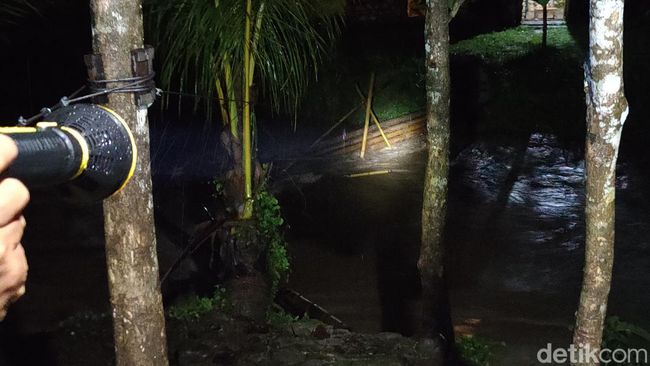 Pantauan detikJogja di lokasi malam ini, kondisi jembatan sudah hilang tersapu derasnya arus Sungai Tinalah. Sungai ini meluap imbas diguyur hujan sejak sore tadi.