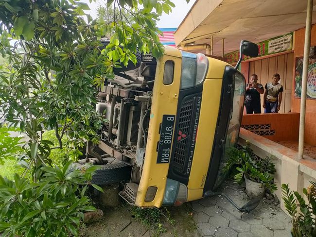Beruntung saat kejadian tidak ada orang di sekitar lokasi. Adapun truk itu dalam posisi terguling tepat di depan rumah warga. Tim relawan pun dikerahkan untuk mengevakuasi truk tersebut.