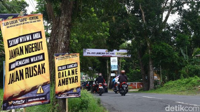 Beberapa di antaranya bertuliskan 'Sayangi Nyawa Anda, Jangan Ngebut Anda Memasuki Wilayah Jalan Rusak', 'Tuku Rujak Tekan Pati Dalane Rusak Sing Ngati-ati', 'Pelan-pelan Sudah Banyak Korban, 'Jatuh di Aspal Tak Seindah Jatuh Cinta', 'Pajake Lancar Dalane Ambyar', dan lain sebagainya.