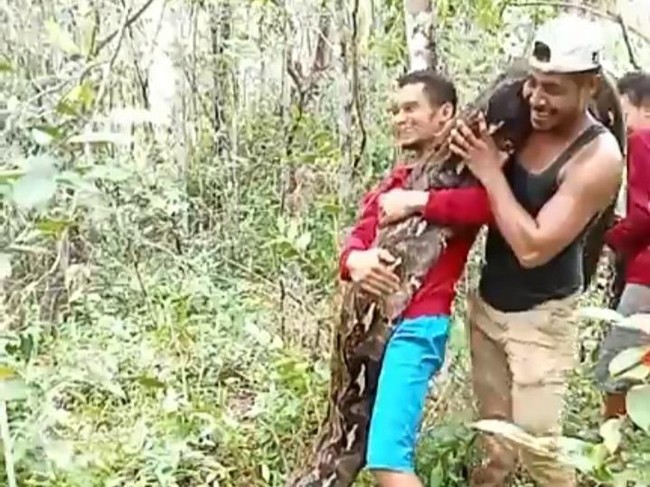 Setelah memastikan ularnya sudah mati, mereka membopong bangkainya ke kampung. Badannya yang besar membuat mereka harus memikulnya beramai-ramai.