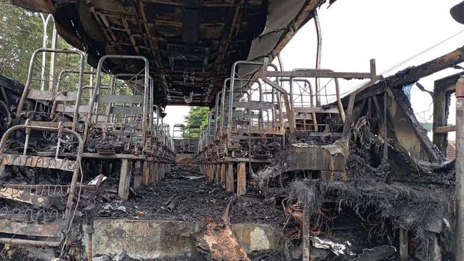 Berdasarkan foto yang diterima detikJogja, tampak bagian dalam bus terbakar. Kursi bus hanya menyisakan kerangka besi saja. Selain itu, bagian bodi bus sebagian juga ikut terbakar.