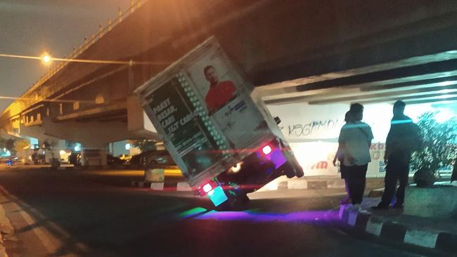 Sebuah mobil boks ekspedisi oleng dan nyangkut di bawah flyover Janti, Jogja. Begini peristiwanya.