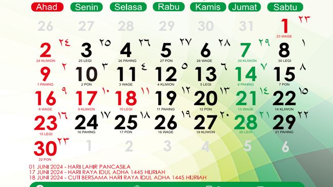 - Senin, 17 Juni 2024: Libur Nasional Hari Raya Idul Adha 1445 Hijriah