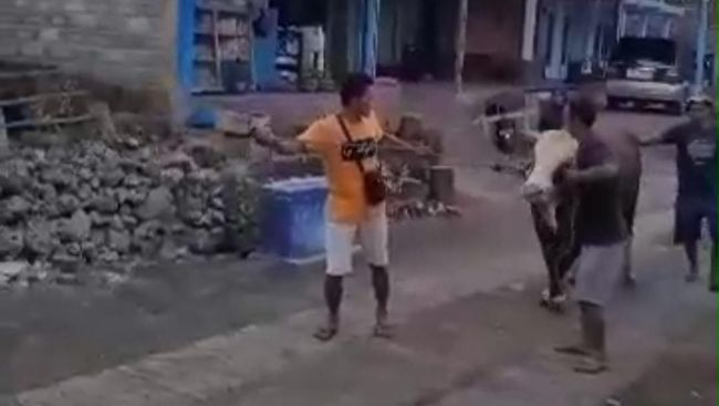 Namun, Sugi dan laki-laki lainnya tetap berusaha menarik sapi itu lagi. Seorang lainnya terdengar memberikan aba-aba untuk membawa sapi tersebut.