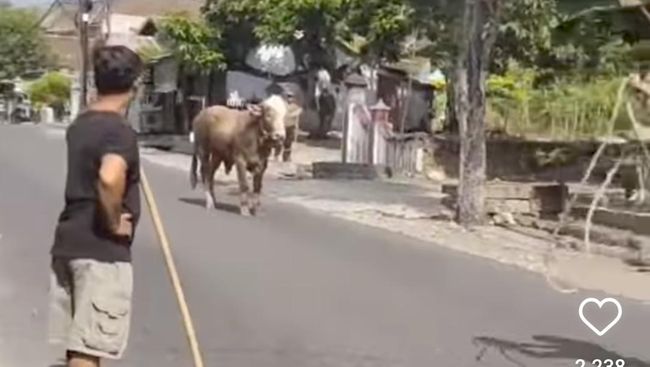 Di video tersebut tampak sapi sedang dihadang oleh sejumlah warga di jalan. Tampak mereka membawa tongkat bambu dan tali. Warga pun terlihat memukul jalan menggunakan bambu.