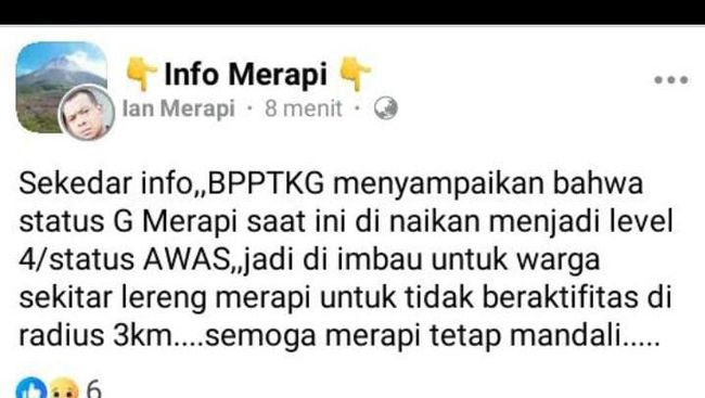 Media sosial ramai dengan unggahan informasi tentang Gunung Merapi yang naik status menjadi awal. Salah satu unggahan di grup Facebook Info Merapi dituliskan bahwa BPPTKG Jogja telah menaikkan status Gunung Merapi menjadi Awas atau Level IV.