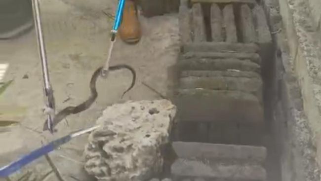 Setelahnya, hewan melata itu langsung bersembunyi di tumpukan bata dekat pot bunga. Didik menyebut ada sekitar 20 pot dan 200 bata di depan rumah Tutik.