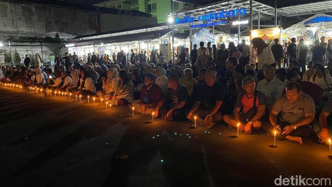 Doa bersama para pedagang ini dilakukan sekitar pukul 20.00 WIB. Ratusan pedagang duduk bersila dengan menyalakan lilin.