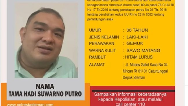 Tama Hadi Suwarno Putro (36) diburu polisi di Sleman. Pria bertubuh gemuk ini diburu terkait kasus penganiayaan terhadap anak.