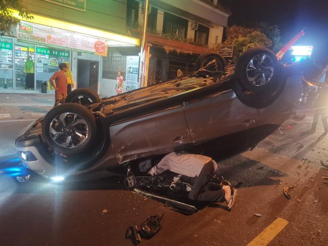 Setelah menabrak mobil parkir itu, mobil BR-V itu terguling ke sisi kanan jalan. Pada waktu yang bersamaan, ada pengendara motor Kawasaki Ninja berinisial ROY yang tengah melintas dari arah utara ke selatan. Tak sempat menghindar, motor ROY membentur mobil terguling itu hingga dia terjatuh.