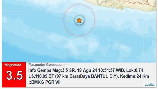 "Info Gempa Mag:3.5, 19-Agu-24," kata Badan Meteorologi, Klimatologi, dan Geofisika (BMKG) DIY dalam keterangan tertulisnya, Senin (19/8/2024).