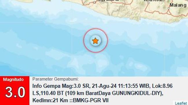 "Info Gempa Mag:3.0, 21-Agu-24," kata Badan Meteorologi, Klimatologi, dan Geofisika (BMKG) DIY dalam keterangan tertulisnya dikutip detikJogja, Rabu (21/8/2024).