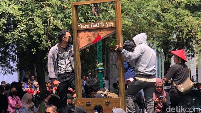 Kemudian di tengahnya ada dua mobil, salah satunya terdapat pisau guillotine dan satunya lagi mimbar. Berdasarkan pantauan di lapangan, mobil tersebut tidak melakukan aksi teatrikal.