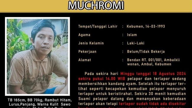 Seorang pria asal Kebumen, Muchromi (31), dilaporkan hilang oleh keluarganya usai membersihkan kandang ayam di Wonosari, Gunungkidul. Berikut ciri-cirinya.