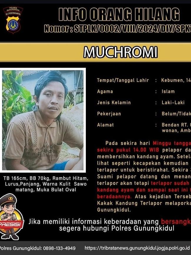 Jika detikers mengetahui keberadaan Muchromi bisa menghubungi langsung Polres Gunungkidul di nomor 08981334949.