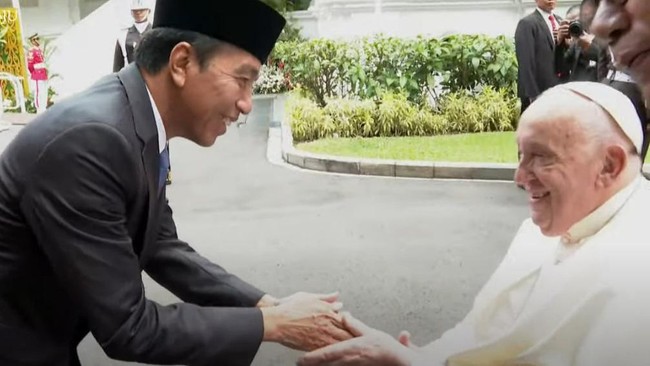 Sementara itu, Presiden Jokowi yang berada di pintu masuk Istana Merdeka langsung menyambut kedatangan Paus. Jokowi tampak menyapa dan menyalami Paus sambil tersenyum.